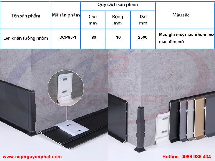 Len chân tường nhôm cao cấp thường gọi là DCP80 được sản xuất từ chất liệu hợp kim nhôm cao cấp, với màu sắc chủ đạo gồm nhôm mờ, ghi mờ, đen mờ. Với khả năng chịu nước, không mối mọt, có độ bền cao. Nên sản phẩm dần được thay thế cho nẹp nhựa, nẹp gỗ.