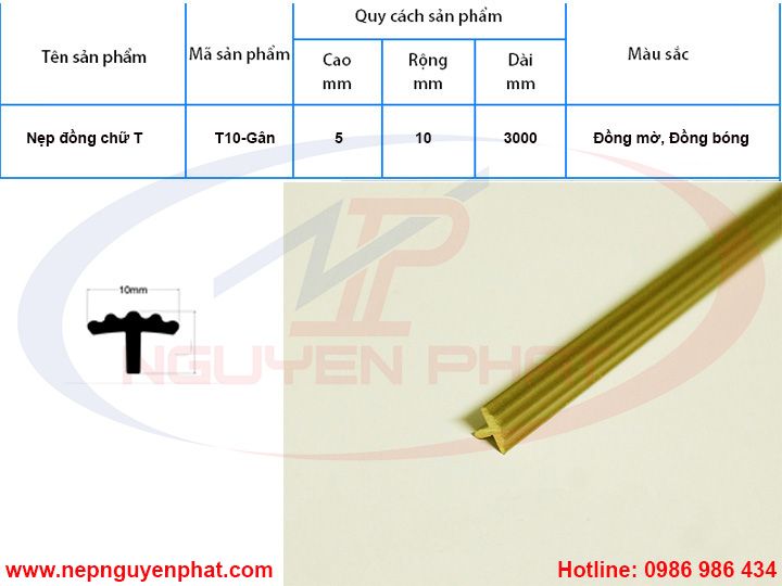 Nẹp chỉ đồng chữ T 10mm - gân hay còn gọi là nẹp chỉ đồng chống trơn cầu thang hình chữ T rộng 10mm, với hình dạng trơn hoặc có gân chống trơn trên bề mặt, sản phẩm được đùn ép từ đồng nguyên chất có pha thêm các chất phụ gia khác để tăng độ cứng. Sản phẩm do Tổng kho nẹp Nguyên Phát sản xuất và phân phối, có chất lượng cao, giá thành hợp lý.