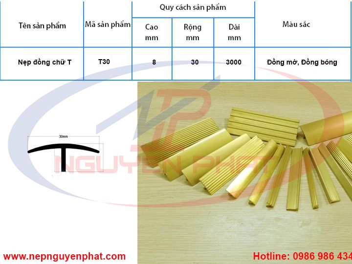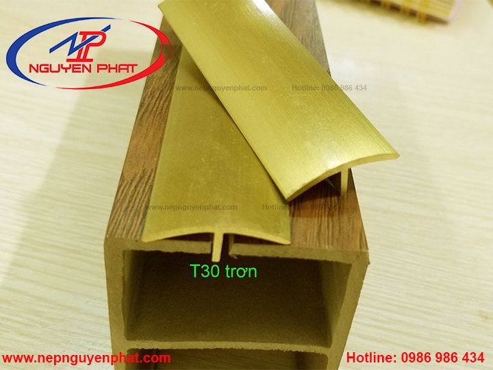 Nẹp đồng chữ T 30mm hay còn gọi là nẹp chỉ đồng hình chữ T rộng 30mm, với hai hình dạng khác nhau gồm T30 đồng gân và T30 đồng trơn. Sản phẩm được đùn ép từ đồng nguyên chất có pha thêm các chất phụ gia khác để tăng độ cứng. Sản phẩm do Tổng kho nẹp Nguyên Phát sản xuất và phân phối, có chất lượng cao, giá thành hợp lý.