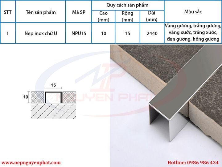 Nẹp inox chữ U 15mm hay còn gọi là nẹp U inox rộng 15mm chủ yếu dùng để trang trí, tạo điểm nhấn trên vách đá, vách kính, ngoài ra có thể bo mép tấm kính 13-14mm. Sản phẩm được sản xuất gia công gấp mép hoặc soi rãnh từ tấm inox 304 nên có độ cứng cao, màu sắc sáng bóng, độ bền và tính thẩm mỹ cao.