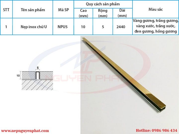 Quy cách: Rộng 5mm x Cao 10mm x Dài 2440mm