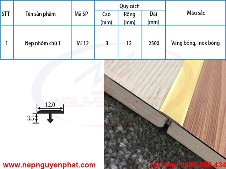 Tổng kho nẹp Nguyên Phát là đơn vị cung cấp nẹp hợp kim nhôm cao cấp có uy tín lâu năm hiện nay. Quý khách hàng nên tham khảo. Nguyên Phát không chỉ cung cấp nẹp nhôm chữ T 12mm mà còn hàng trăm sản phẩm khác nhau như nẹp nhôm chữ U, nẹp nhôm chữ L, nẹp chống trơn cầu thang,...chất liệu cũng đa dạng để khách hàng có thể lựa chọn sản phẩm mình ưng ý nhất. Để liên hệ trực tiếp Quý khách vui lòng liên hệ: