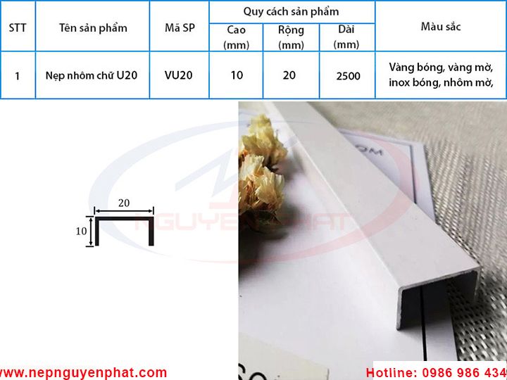Vậy để mua đúng sản phẩm nẹp nhôm chữ U 20mm của Nẹp Nguyên Phát - được đảm bảo về chất liệu, kích thước, màu sắc cũng như cam kết về các chính sách hậu mãi sau mua hàng - Quý khách vui lòng liên hệ:
