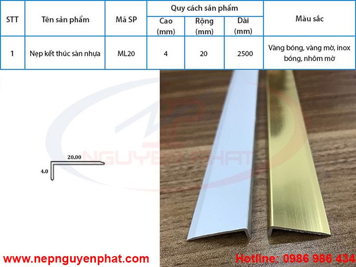 1.2. Thông số kỹ thuật của nẹp nhôm kết thúc sàn nhựa ML20
